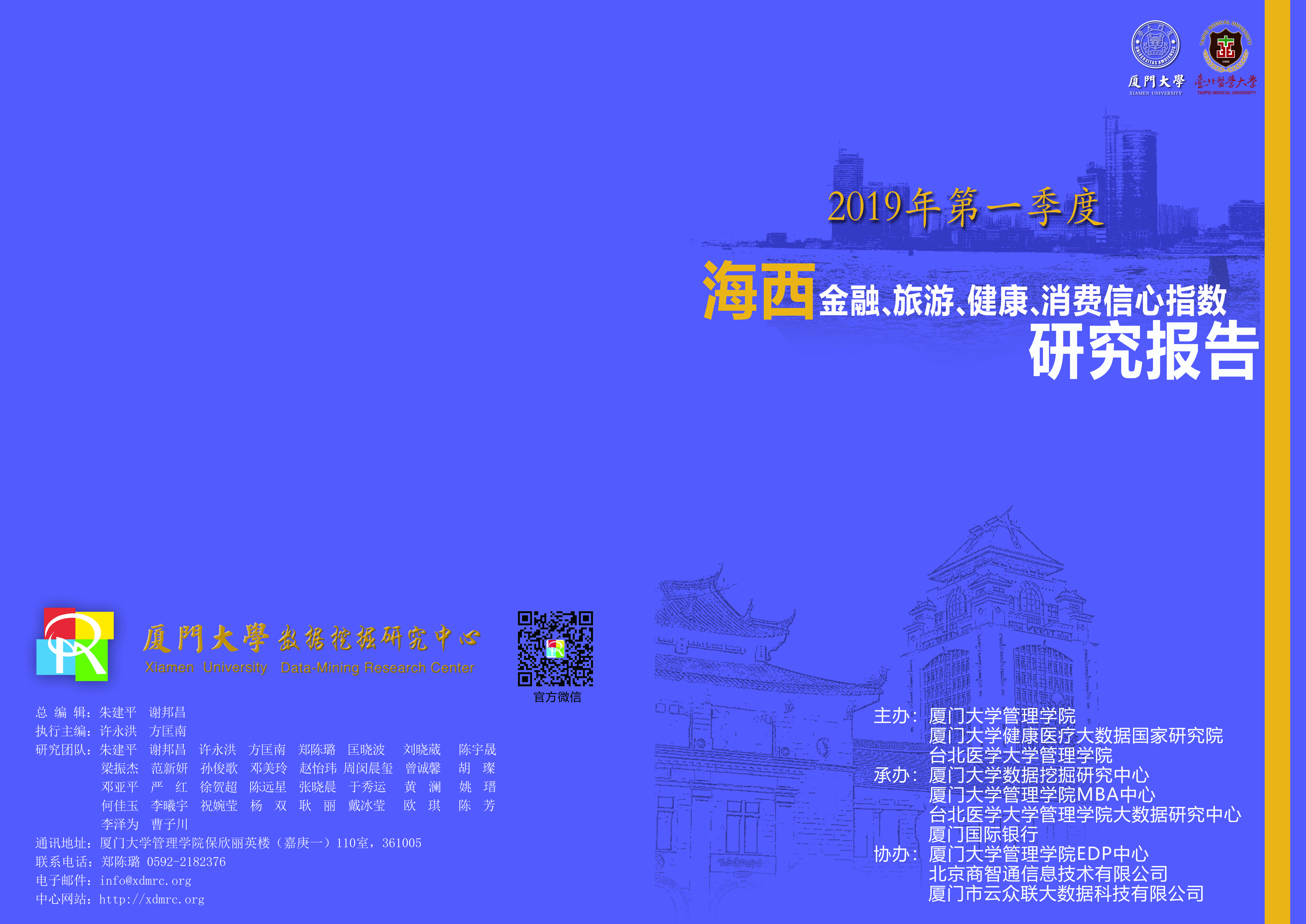 2019年4月29日,由厦门大学管理学院、厦门大学健康医疗大数据国家研究院、台北医学大学共同发起,厦门大学数据挖掘研究中心研发的“2019年第一季度海西金融、旅游、健康、消费信心指数研究报告”正式发布。本季度是第41次厦门金融、旅游、健康、消费信心指数调查及第37次海西金融、旅游、健康、消费信心指数调查,本季度报告首次加入了健康指数调查。