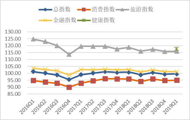 2019年第一季度海西地区金融、旅游、健康、消费信心总指数为100.30点,环比(较2018年第四季度,下同)上升1.80点,同比(较2018年第一季度,下同)上升0.51点。其中消费指数94.23点,环比上升0.24点,同比下降0.65点;旅游指数113.45点,环比无变化,同比下降2.45点;金融指数101.65点,环比上升0.10点,同比下降1.68点;首次加入的健康指数为110.05点。