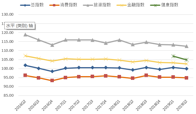 总体来看,相比于上季度,本季度各项指数呈下降趋势,总指数降到100点以下,且消费指数中的各项分指数均不足100点。对总指数起拉动作用的旅游指数、金融指数和健康指数及其各项分指数降幅也均在1%以上,虽然这三项指数仍处于高位景气区域,但依然需要关注和重视经济下行压力带来的各方面影响。今年上半年,受全球经济复苏放缓、中美贸易摩擦等负面形势影响,中国经济金融形势也较为严峻,但随着以“六稳”为代表的政策实施落地,经济运行中的稳定因素也在增多。展望下半年,尽管外部环境仍存诸多不确定性,但国内政策和市场环境均趋于好转,预计经济有望企稳。