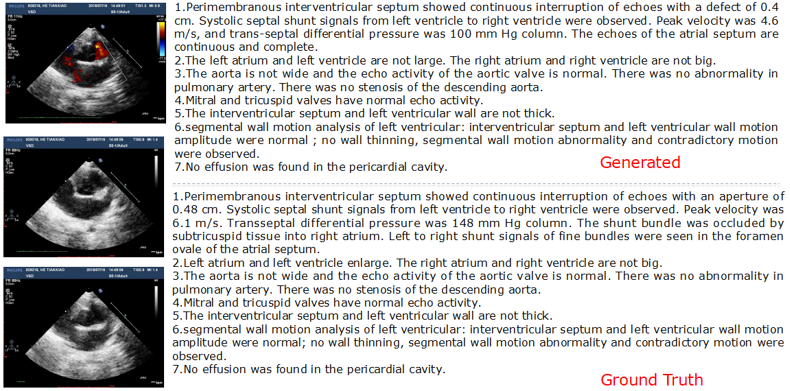 纪荣嵘教授团队参加的心血管超声诊断报告自动生成比赛由深圳鹏城实验室、清华大学和武汉亚洲心脏病医院联合组织发起。多年来,心室中膈缺损(VSD)和心房中膈缺损(ASD)成为人类健康的巨大威胁,传统的超声波心动描技术,即超声医师在超声扫描仪前通过分析不同切片(视图)的超声图像来完成超声诊断报告,广泛用于医院诊断。但由于专业人员短缺、工作量过大和经验不足等因素,人工生成的报告往往比较粗糙。因此,迫切需要一个智能的计算机辅助报告生成系统来减少医师的工作量和错误的发生。比赛针对这两大常见先心病,设置了7个公认的文本匹配度评估指标(BELU-1, BELU-2, BELU-3, BELU-4, CIDER, METEOR, ROUGE),要求参赛队伍设计智能模型,能根据超声影像自动生成接近医生水平的医学诊断报告。