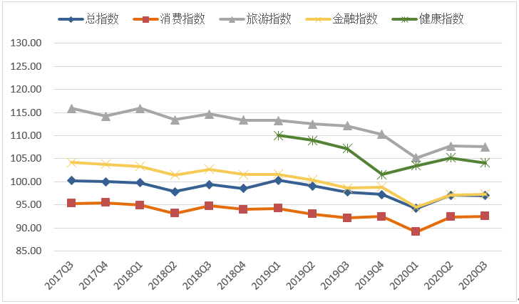 2020年第三季度海西地区金融、旅游、消费、健康信心总指数为96.99点,环比(较2020年第二季度,下同)下降0.10点,同比(较2019年第三季度,下同)下降0.76点。其中消费指数92.49点,环比上升0.09点,同比上升0.35点;旅游指数107.53点,环比下降0.17点,同比下降2.38点;金融指数97.30点,环比上升0.13点,同比下降1.33点;健康指数104.13点,环比下降1.03点,同比下降3.05点。