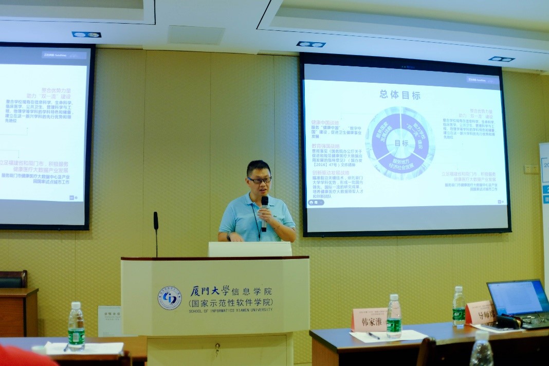研究院副院长李奇渊教授介绍了研究院建设进展,主要从研究院总体情况和建设进展两个方面进行详细阐述。研究院由中国卫生信息与健康医疗大数据学会与厦门大学共建,于2018年9月26日正式挂牌成立。2020年6月,研究院申请的“健康大数据与智能医学”交叉学科获批,并于2020年7月成立了学位评定工作小组。目前已汇聚来自学校数十个学院及附属医院的40多位博导、20多位硕导及其研究团队,连续四年招收健康医疗大数据方向博士生共53人,2020年新增硕士招生,目前共有在校硕士生30名。研究院发挥学科优势和人才优势,已与多家相关政府单位和企业建立合作关系,不断推动健康医疗大数据教学科研和产业融合发展。