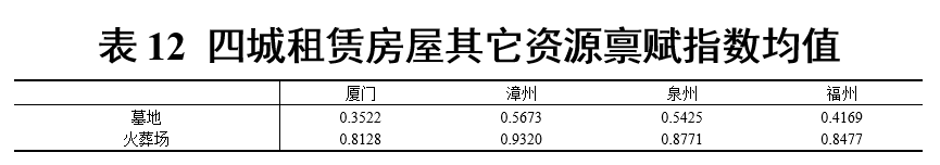 除了以上提到的资源禀赋以外,还存在另外一些对租赁房屋居住者有着较强烈影响的资源点,此处选取专家认为影响最为强烈的两个相似的资源点作为代表,即墓地与火葬场,四城均值如表12所示。墓地与火葬场均为负向指标,且在城市中的分布一般均极为紧密,对小区的影响也极为类似。