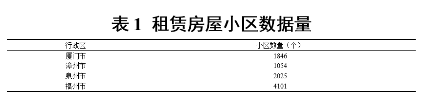 如表1所示,本报告使用的数据主要包括四座城市:厦门市、漳州市、泉州市与福州市的小区详情数据和小区周边资源禀赋情况。经过多方对比和估价师确定最终选择云评众联数据库中2020年1月到10月的小区详情数据。