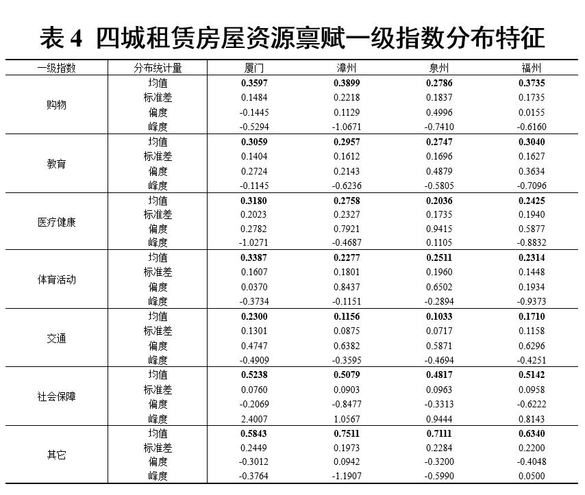 表4计算了四座城市租赁房屋资源禀赋一级指数的四个分布统计量,包括均值、标准差、偏度与峰度。分别从一级指数的平均水平、离散程度、极端值特征以及集聚程度四个不同的角度描述了一级指数的分布特征。