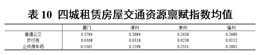 交通资源禀赋指数共分为五个部分:普通公交、快速公交、地铁、步行街和公共停车场。分别从普通公共交通、快速公共交通、道路易拥堵程度及私家车出行便捷程度四个方面考量了交通的整体资源分布特征,有助于为城市交通规划提出丰富内涵的意见与建议。由于该领域的二级指数较多,因此此处仅以普通公交、步行街和公共停车场为例,四城均值如表10所示,快速公交和地铁资源禀赋指数与普通公交的特征类似,在此不再赘述。