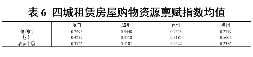 购物资源禀赋由便利店、超市和农贸市场三个部分组成,反映三个等级购物场所以数量和距离综合表示的资源丰富程度,四城均值如表6所示。