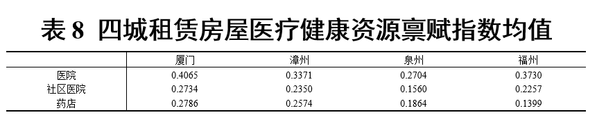 表8 四城租赁房屋医疗健康资源禀赋指数均值