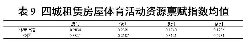 表9 四城租赁房屋体育活动资源禀赋指数均值