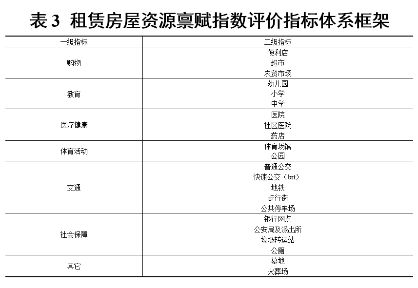 本次研究切实结合当前网络舆情、市场现状、民生民愿,通过深入调查,根据租赁房屋的空间分布特征和实际情况,在经验性标准和统计学方法的基础上,构建了“租赁房屋资源禀赋评价指标体系”。借鉴国内外“生活圈”相关研究理论和《城市居住区规划设计标准》等规范性标准,力求系统全面、客观有层次地反映四座城市租赁房屋生活圈理想程度。该评价体系由二级指标构成,详见表3。