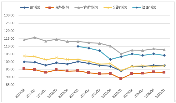 总指数及旅游、消费、健康三大指数略微下滑,金融指数小幅上升