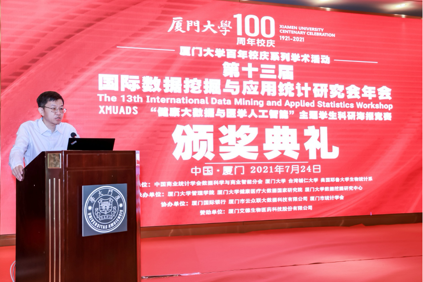 2021年7月23日至25日,第十三届“国际数据挖掘与应用统计研究会年会”在厦门圆满落幕。该年会由中国商业统计学会数据科学与商业智能分会、厦门大学、台湾辅仁大学、美国耶鲁大学生物统计系联合主办,厦门大学管理学院、厦门大学健康医疗大数据国家研究院、厦门大学数据挖掘研究中心联合承办,厦门国际银行、厦门市云众联大数据科技有限公司、厦门市统计学会联合协办。会议采取“线下会议+线上直播”的形式,线下300余人参加会议,线上5.6万余人观看直播。