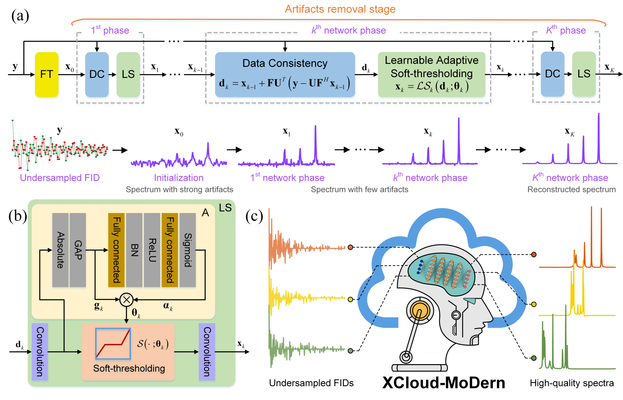 在该工作中,结合稀疏最优化和深度学习的优点,屈小波教授团队提出了一种深度自适应阈值网络,称为MoDern(图1)。它遵循求解稀疏模型的迭代重建过程来构建神经网络架构,并精心设计了一种可学习的软阈值模块来自适应地消除欠采样带来的频谱伪影。大量合成和磁共振生物实验数据的结果表明,MoDern突破了最先进方法的性能瓶颈,能够实现鲁棒、高保真和超快速的重建,同时网络的可解释性强。此外,MoDern的网络结构紧凑,网络参数少,并且仅使用指数函数的合成数据进行训练。由于其在训练和测试数据不匹配方面展现的鲁棒性,它可以很好地在各种场景下对生物磁共振实验数据进行泛化,而无需重新训练。