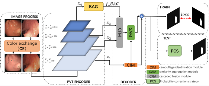 BP-Trans基于PVT(Pyramid Vision Transformer)对内镜影像建立多尺度特征图,并利用边界感知模块为精确的边界分割提供额外的先验知识。此外,由于单个患者的内镜影像通常表现为相同的颜色分布且不同患者的颜色分布有较大的差异,模型的泛化性受到极大影响,因此BP-Trans采用color exchange (CE)交换不同患者的颜色分布,作为数据增广来消除颜色对模型的影响,并采用Probability correction method (PCS)来提高正样本预测率,同时减少负样本干扰。