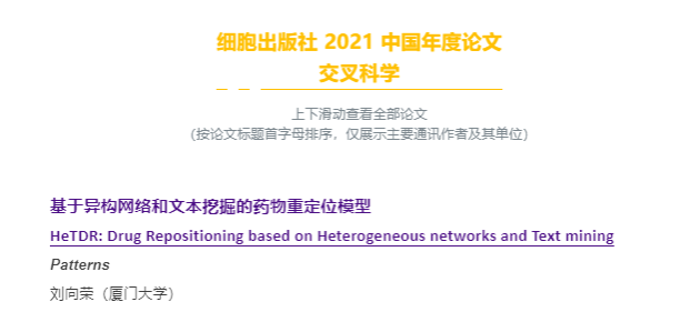 近日, “中国科学家与Cell Press” 2021年度论文及网络票选最受欢迎中国论文正式揭晓,信息学院、健康大数据国家研究院刘向荣老师的论文“HeTDR: Drug repositioning based on heterogeneous networks and text mining”(发表于Patterns)入选交叉科学领域年度论文。