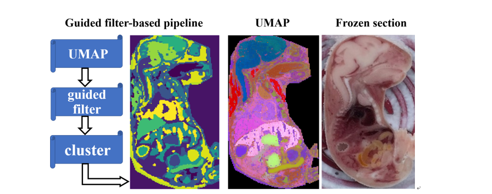 首先,课题组通过大量数值实验,总结归纳MSI空间分割的主要步骤,并对关键数据滤波这一步骤在分割流程中的优先级和滤波算法进行优化,提出了MSI最优空间分割流程(pipeline),如图1所示。以小鼠胚胎的MSI数据为例,从目视检测、空间一致性、时间成本和鲁棒性等多方面评估了该流程的性能,证明了该流程的优越性。该项工作于2021年3月发表在 Analytical Chemistry 上。