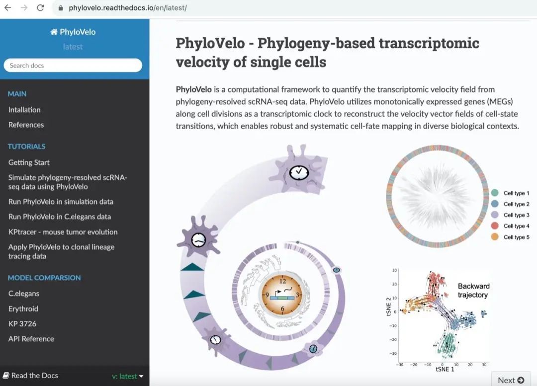 总之,PhyloVelo是一种利用单细胞谱系和转录组数据重建细胞命运转变的新方法,具有高度的准确性和鲁棒性。PhyloVelo不仅可以克服传统RNA velocity方法的局限性,还可以发现隐藏在转录组数据中的“时钟基因”,为揭示细胞分化的分子机制提供线索。PhyloVelo为研究生物发育和疾病进展提供了一个有力的工具,也为未来的单细胞谱系和转录组数据分析提供了一个新的视角。为了方便读者使用PhyloVelo方法,研究团队还在线发布了使用手册和具体应用案例,详见网站: