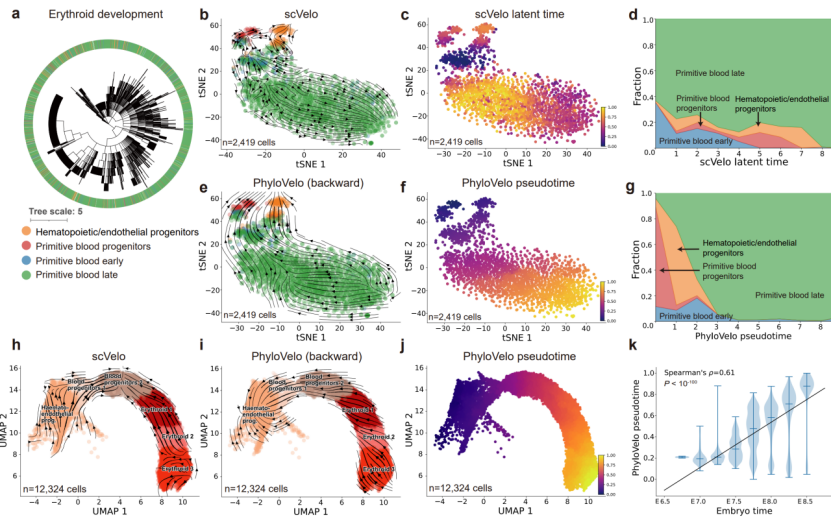 此外,PhyloVelo还在小鼠早期胚胎发育中表现出优于RNA velocity的性能,能够准确地识别出红细胞系列中血液/内皮祖细胞作为最早期的细胞类型,并且与细胞增殖能力呈强相关(图3)。
