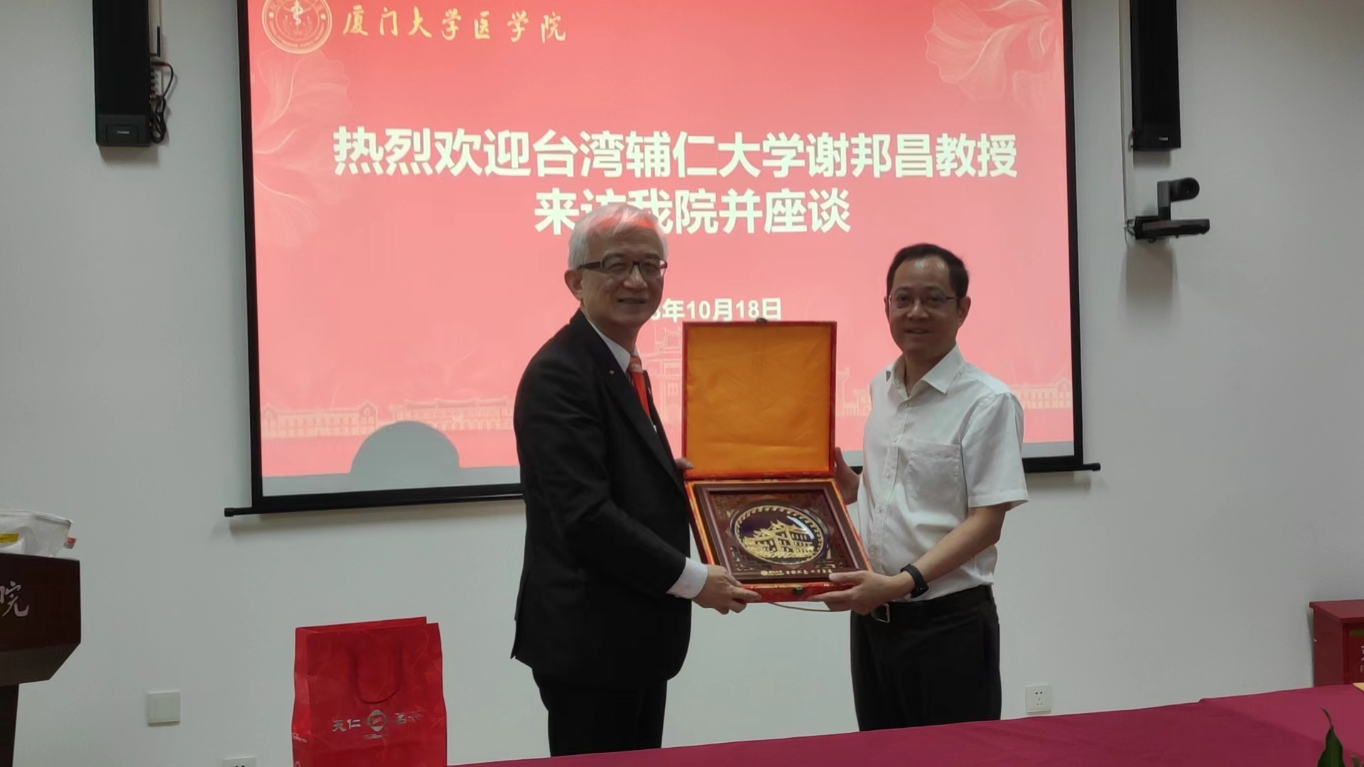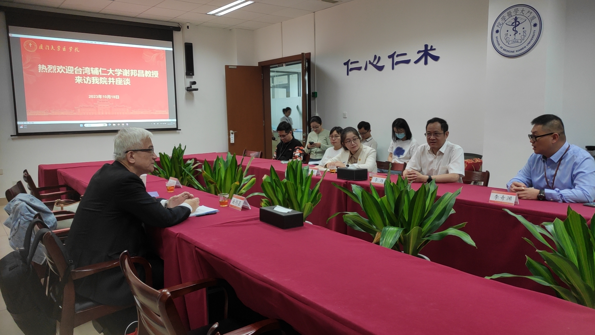 10月18日上午,台湾辅仁大学副校长谢邦昌教授在厦门大学公共卫生学院江宜珍副教授的陪同下赴医学院开展学术交流。参加本次公共卫生两岸院长交流活动的人员有医学院副院长李炜教授、厦门大学健康医疗大数据国家研究院副院长李奇渊教授、医学院杨金秋副教授、学院办公室主任尹青萍老师、健康医疗大数据国家研究院郭嘉阳助理教授、周颖老师等和学生代表。