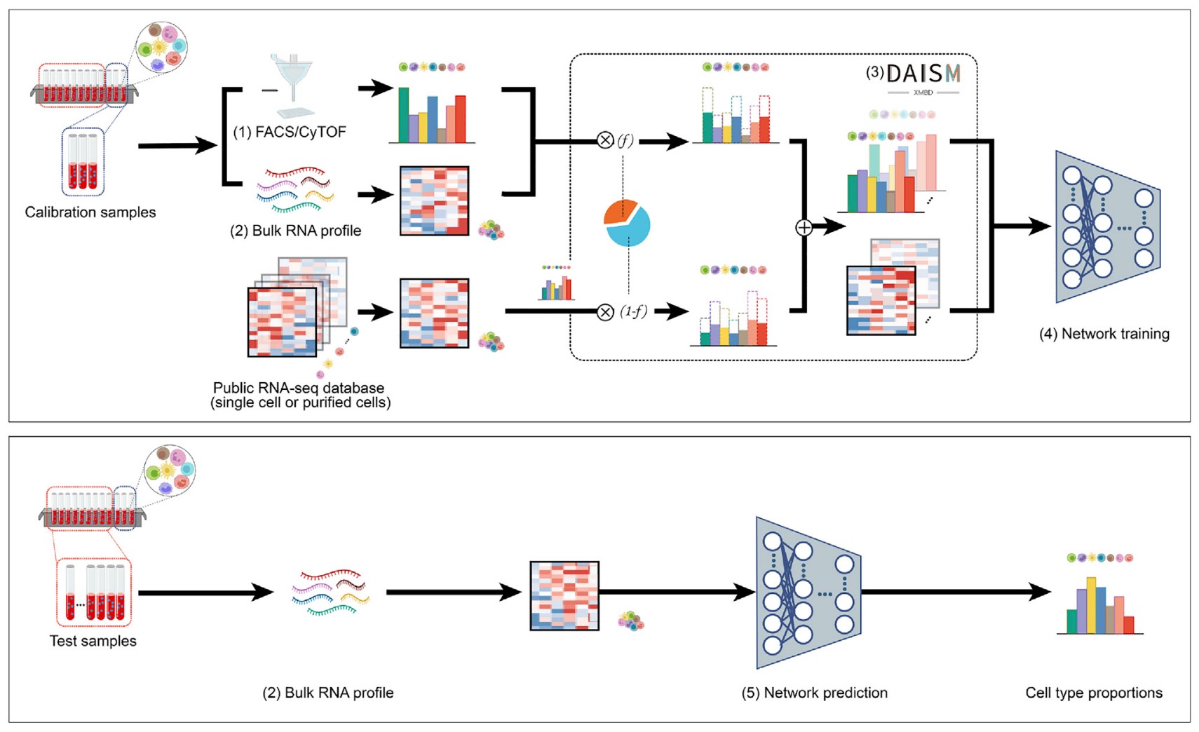深入剖析免疫微环境,阐明混合样本中细胞类型的贡献,并检测细胞群响应感染或药物的变化是具有挑战性的。计算生物学家开发了多种反卷积算法探究复杂组织微环境中的细胞组成成分及丰度。然而传统基于预定义分子谱进行回归的细胞丰度预测方法存在一定的性能瓶颈。为解决这一难题,厦门大学俞容山团队开发出的一种数据驱动的细胞反卷积方法DAISM-DNNXMBD(图1)。该方法通过干湿结合的策略,先通过湿实验的方法,获得特定实验条件下一定数量的校准样本,再通过计算机混合策略的新型数据增强方法DAISM,从校准样本扩增出足够的训练数据进行深度神经网络(DNN)训练,从而获得针对目标实验条件的细胞比例预测反卷积模型。实验结果表明,对于现实世界数据集中评估的所有细胞类型,DAISM-DNN 预测的比例准确度始终优于其他现有方法。因此,通过严格的SOP,我们可以为多个生物医学实验创建“一次训练,多次重复使用”的 DAISM-DNN 模型,有望在大规模的临床研究应用中发挥重要的作用。