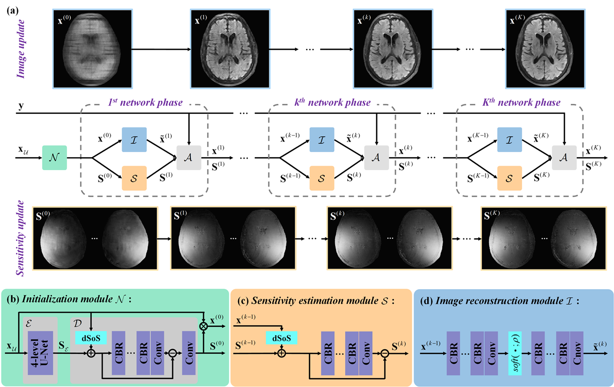 近日,厦门大学健康医疗大数据国家研究院、电子科学与技术学院屈小波教授团队在生物医学和健康信息学顶级期刊《IEEE Journal of Biomedical and Health Informatics》上发表论文“A Faithful Deep Sensitivity Estimation for Accelerated Magnetic Resonance Imaging” (Zi Wang#, Haoming Fang#, Chen Qian, Boxuan Shi, Lijun Bao, Liuhong Zhu, Jianjun Zhou, Wenping Wei, Jianzhong Lin, Di Guo, Xiaobo Qu*, IEEE Journal of Biomedical and Health Informatics, DOI: 10.1109/JBHI.2024.3360128, arXiv 2210.12723, 2024)。该工作提出了一种基于优化模型展开的联合线圈灵敏度估计与图像重建的深度学习方法。该方法在重建过程中,逐步提供高保真的具有高频信息的灵敏度矩阵,以进一步校正重建图像,实现了高加速倍数下的毫秒级临床适用成像,患者数据适应性好,医生盲评图像质量佳。此外,还通过中间结果可视化以理解网络行为,清晰揭示了灵敏度矩阵和重建图像相互校正的过程。