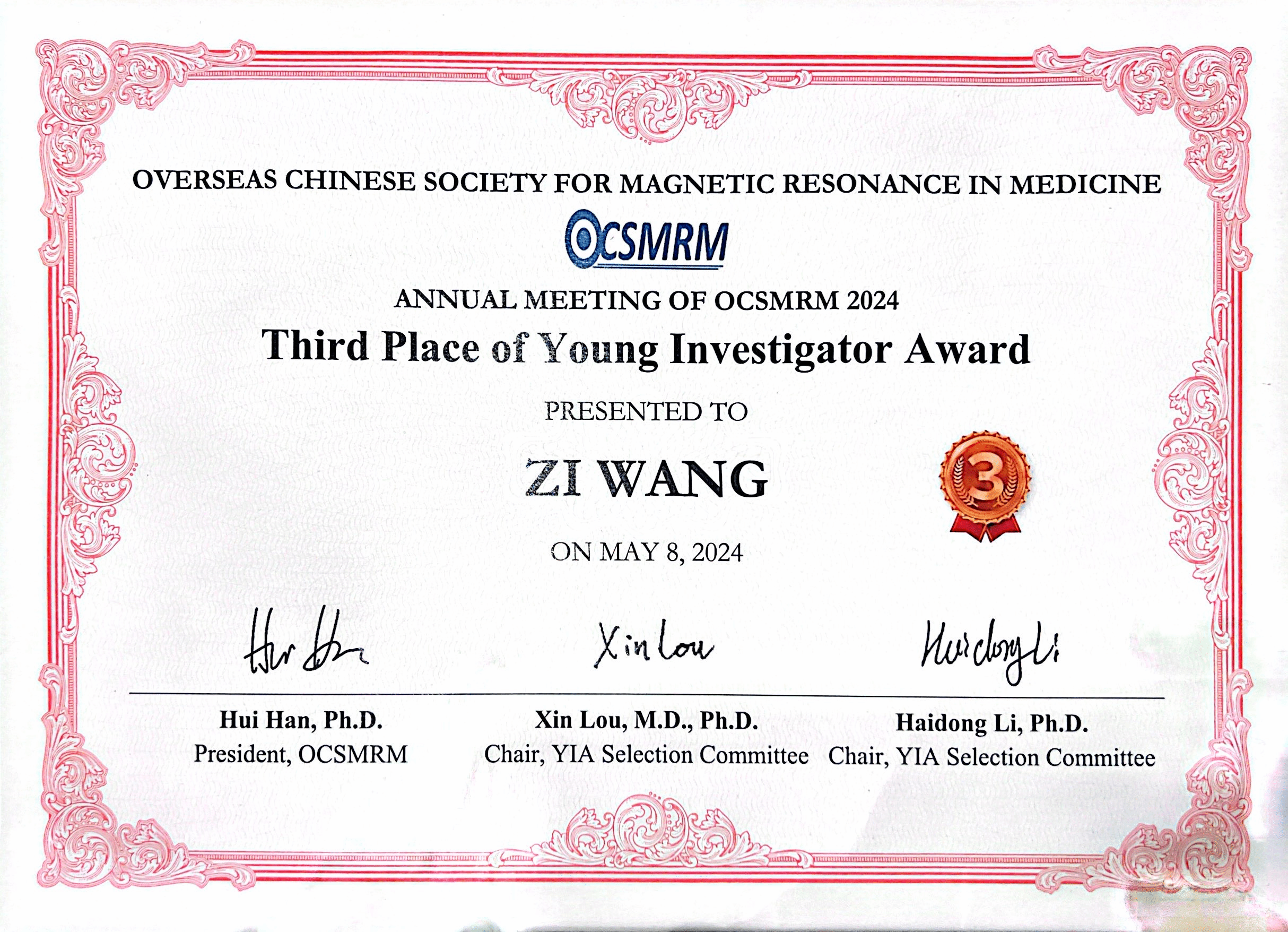 近日,厦门大学健康医疗大数据国家研究院、电子科学与技术学院屈小波教授指导的博士生王孜获得国际华人磁共振学会 (Overseas Chinese Society for Magnetic Resonance in Medicine, OCSMRM) 青年科学家奖 (Young Investigator Awards, YIA),成果获得行业的广泛认可。