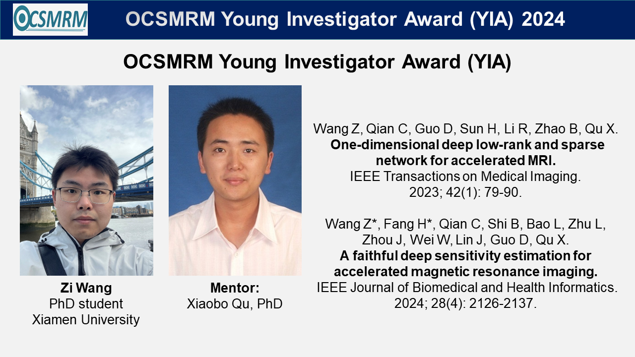王孜获得2024年OCSMRM青年科学家奖,意味着厦门大学在磁共振领域的研究获得了更大范围的认可。两个获奖工作分别发表在计算成像高水平期刊IEEE Transactions on Medical Imaging (TOP, IF 10, 论文: https://doi.org/10.1109/TMI.2022.3203312) 和IEEE Journal of Biomedical and Health Informatics (TOP, IF 7, 论文: http://dx.doi.org/10.1109/JBHI.2024.3360128),提出了高效鲁棒的深度学习快速成像系列方法,实现了高加速倍数下的毫秒级临床适用成像。