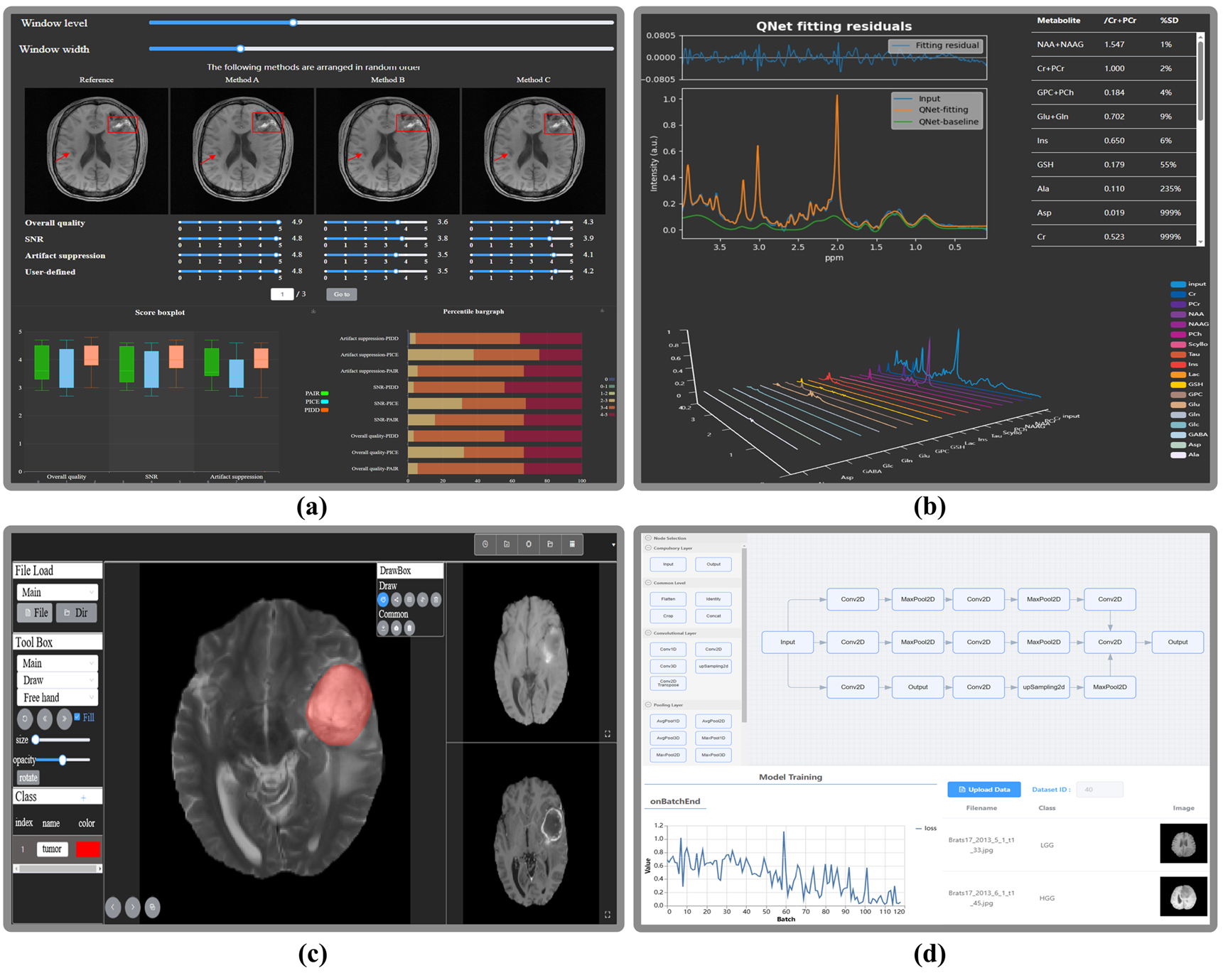 图2. 智能云脑成像平台。(a) 图像在线重建与评分系统,(b) 波谱定量分析系统,(c) 图像标注系统,(d) 可视化神经网络设计和训练系统。注:“脑”代表人工智能。