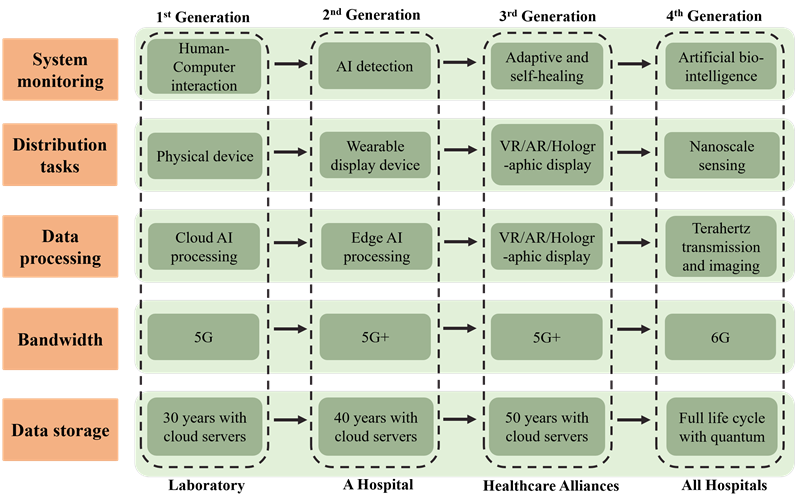 图3展示的是Cloud-MRI系统的四代发展路线,目前已经完成第一代工作 (智能云脑成像平台: https://csrc.xmu.edu.cn/CloudBrain.html),正在进行第二代系统的开发。其中第一代侧重于实验室或放射科级别的基础设施,主要通过将MRI数据加密并传输到云服务器中保存,以便于医生查看和处理。第二代将在医院内完善系统性能,采用MRI参数成像技术,支持命令行传输和自动监测,数据存储时间延长至40年,并引入边缘AI计算和5G+技术以提高传输效率。第三代将推动医师联盟间的发展,实现高分辨率的多核代谢定量信息,并利用虚拟现实、增强现实等技术向临床医生发送诊断结果和治疗计划。最终,第四代覆盖所有医疗机构,采用先进的MRI传感器和量子存储技术,实现对人类生命周期的全面监测,结合6G技术实现毫秒级的网络传输延迟。这些发展将使MRI技术在诊断和治疗方面取得巨大进步,为医疗保健领域带来革命性的变化。