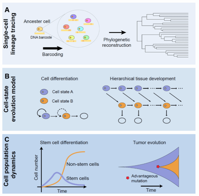 演化动力学通过整合群体遗传学与动力学模型,利用基因序列构建的系统发育树推断种群扩张、迁移等演化参数,从而定量解析种群演化和病毒传播的群体动态规律。近年来,该方法被引入多细胞生物发育与肿瘤演化领域。然而,传统模型受到简化假设限制,难以精准刻画和推断真实组织中细胞谱系多样性、动态分化和增殖速率差异等复杂场景。