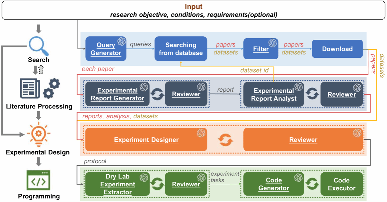 传统生物医学研究面临文献爆炸式增长、跨学科技能需求高、实验设计逻辑复杂等挑战,而现有AI技术多聚焦于单一任务(如文献分析、代码生成),缺乏全流程自动化能力。针对此等问题与挑战,研究团队开发了首个覆盖数据检索、文献处理、实验设计、代码生成全链路的生物医学研究自动化系统BioResearcher,专注于干实验的自动化设计与实现。该系统采用大型语言模型(LLMs)驱动的多智能体协作架构解决跨学科挑战,通过层次化学习方法分解生物医学文献的复杂逻辑结构,实现高效可复现的实验方案自动化设计。
