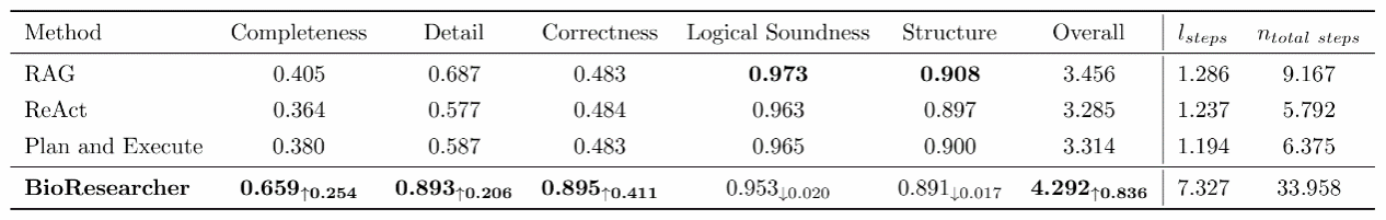 端到端性能:在8项未发表的生物医学研究目标中,BioResearcher平均执行成功率达63.07%,其生成的实验方案在五项质量指标上的表现优于现有的典型大模型智能体基线框架,实验方案质量综合评分(4.292/5)显著优于ReAct(3.285)、Plan-and-Execute(3.314)等基线系统,平均提升22.0%。