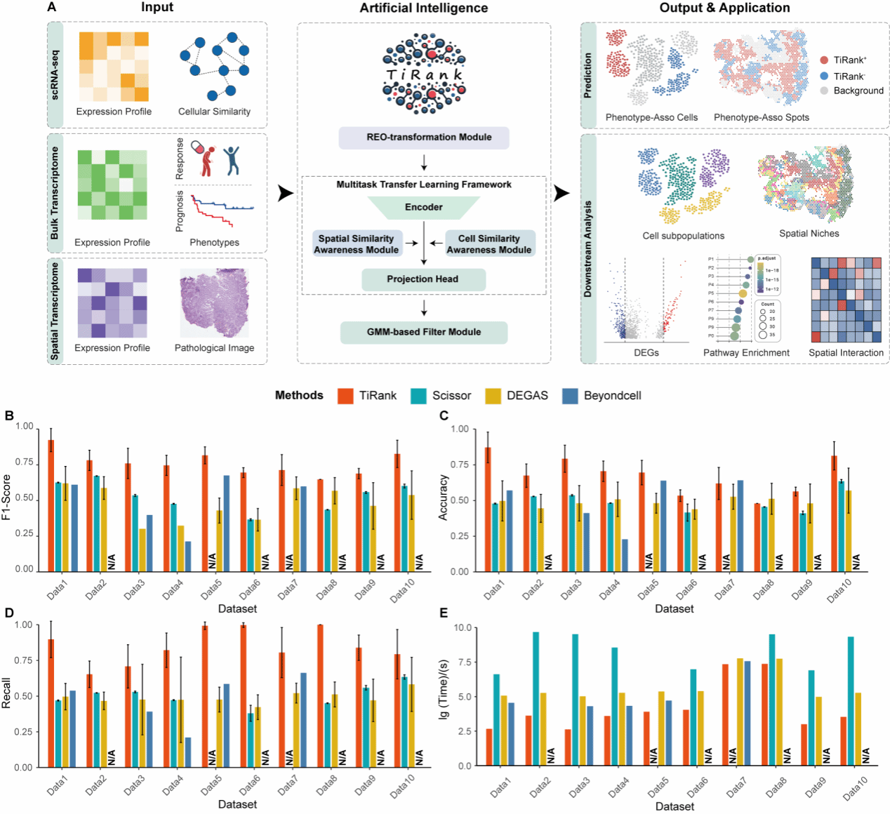 为应对上述问题,研究团队提出TiRank算法框架:首先通过相对表达排序将基因表达转换为“表型相关基因对”表示,以降低不同转录组模态间系统偏差。随后利用多任务迁移学习将多模态转录组数据对齐到统一低维嵌入空间,并在推断阶段输出每个细胞和空间位点的临床相关性,最后结合高斯混合模型对得分分布进行分解,从而提升下游发现的信噪比。