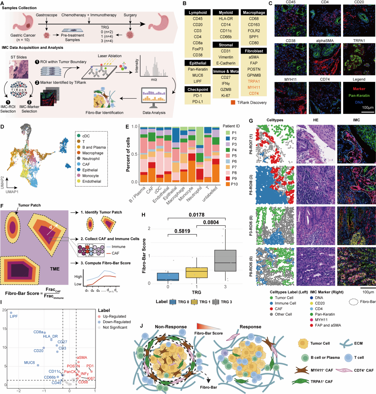作为案例研究,团队将 TiRank 应用于胃癌,在肿瘤边界区域优先识别到一个富集癌相关成纤维细胞(CAF)的空间生态位,并通过独立队列的多重蛋白成像验证其空间分布。该“CAF 富集、呈屏障样聚集并伴随免疫细胞排斥”的边界结构被发现与新辅助化疗联合免疫治疗的疗效相关。进一步地,研究构建了一个量化评分Fibro-Bar Score,定义为肿瘤 patch 边界附近 CAF 与免疫细胞比例的比值,该评分与胃癌患者的治疗不响应有关,具有潜在的临床预测价值。