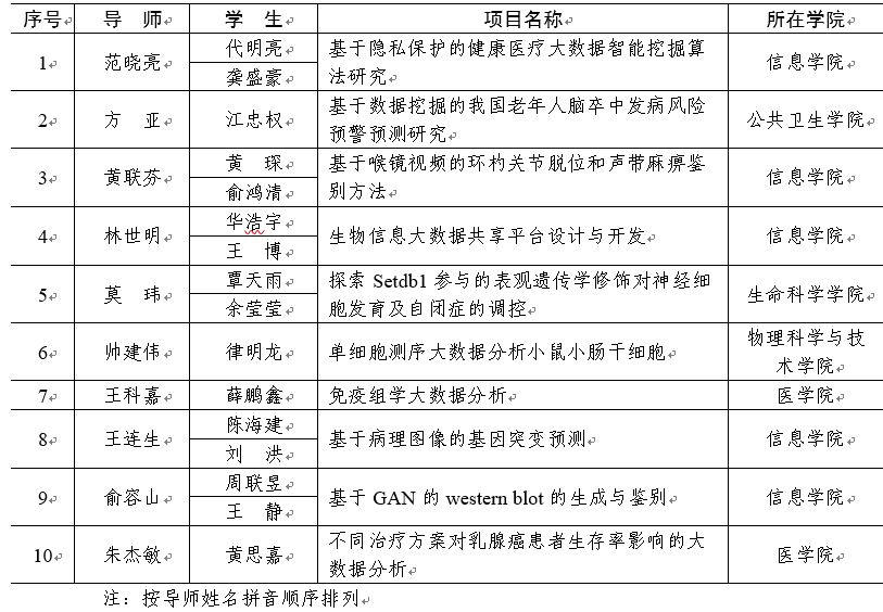 此次共13位导师、20位本科生进行申报,经厦门大学健康医疗大数据国家研究院专家和厦门艾德生物医药科技股份有限公司代表组成的评审小组认真评议,共10位导师、16位本科生通过评审。现将评审结果予以公示,公示时间为2019年8月29日至9月2日。公示期内对评审结果有异议的,请向评审小组提出,受理邮箱为wangchen@xmu.edu.cn。评审小组将在3个工作日内研究答复。